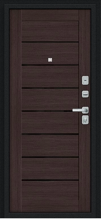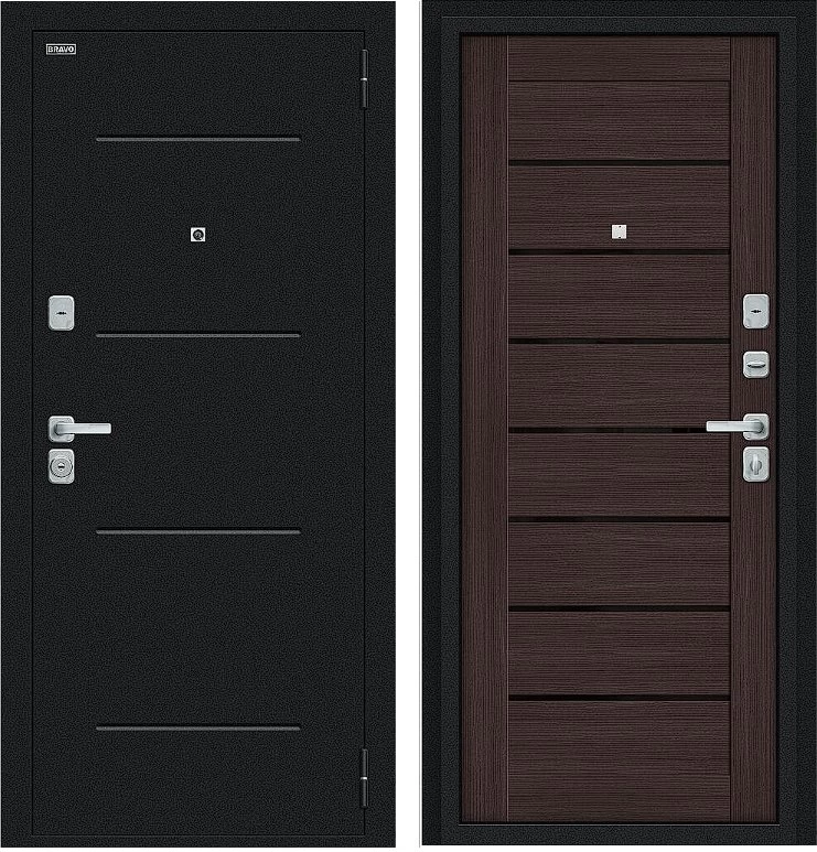 Надежная входная Дверь Браво Техно/BChrome Букле черное/Wenge Melinga премиум класса по цене 34 963 руб. Большая толщина стали защитит от проникновения в ваш дом, квартиру или коттедж. Используется очень качественная фурнитура: замки, цилиндры, ручки, защелки. Покрытие и отделка двери изготовлено под внимательным контролем производителя. Дверь имеет долгий срок службы и гарантию.